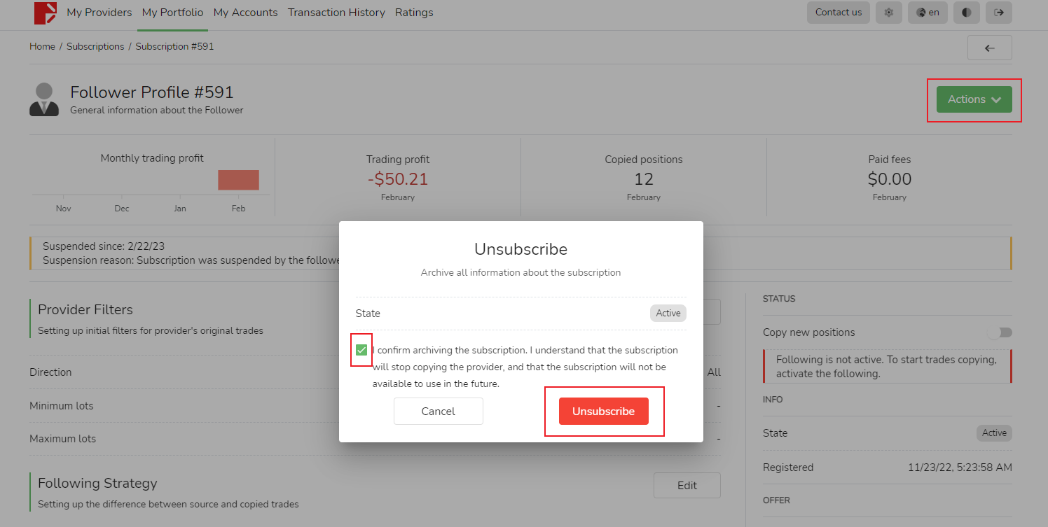 إذا أراد المتابعون التوقف عن المتابعة ، فعليهم النقر فوق الزر الأحمر [إلغاء الاشتراك].