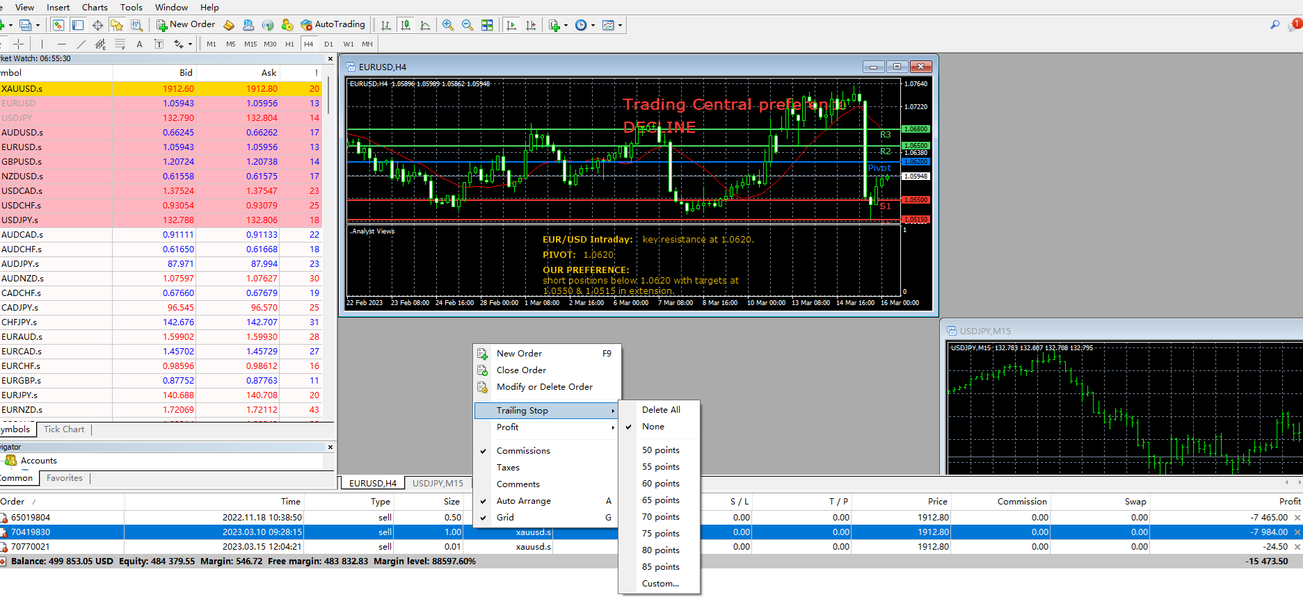 Haga clic en "Negociar" en la barra de la terminal para ver las órdenes existentes, luego haga clic con el botón derecho para seleccionar la orden de espera, haga clic en "Trailing Stop" y seleccione "Personalizado", y complete la cantidad de puntos de parada dinámica que necesita establecer.
