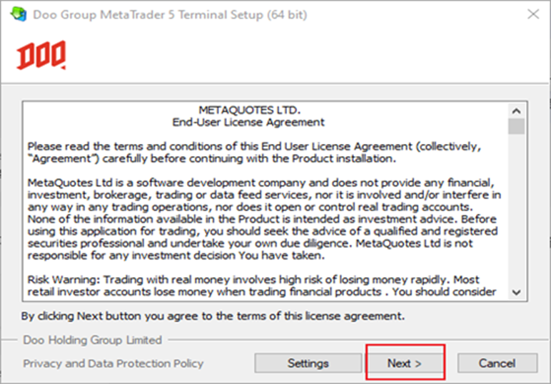 Una vez completada la descarga de la versión de escritorio de Windows MT5, haga clic en [Siguiente] en la figura de acuerdo con la guía de instalación para comenzar la instalación.