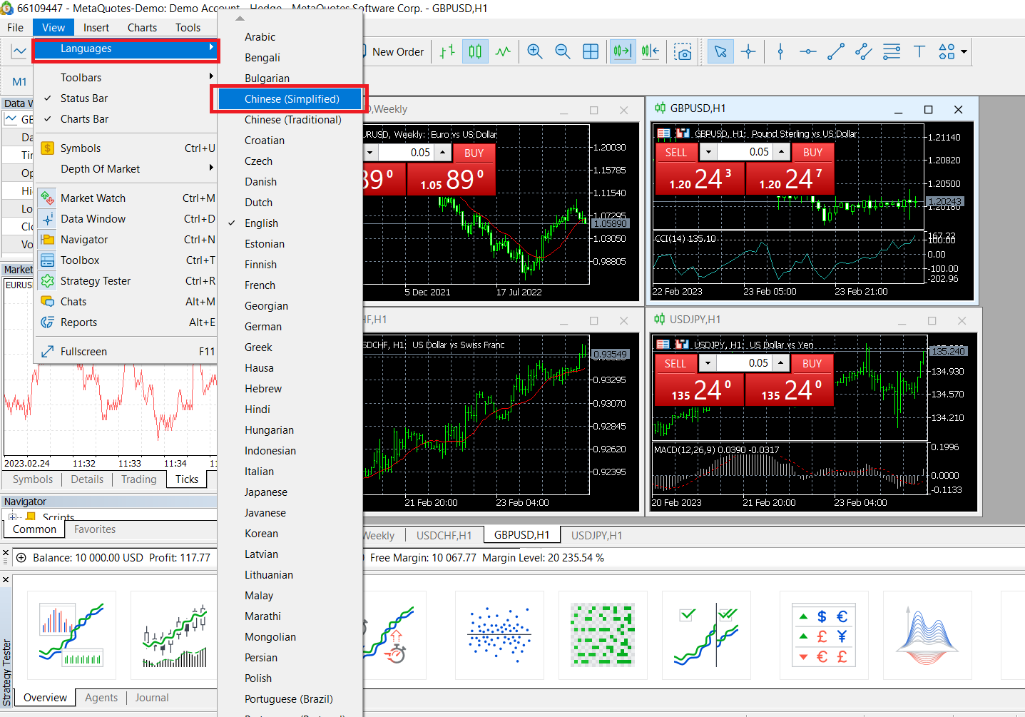 Al instalar MT5, el idioma predeterminado es inglés automáticamente. Para cambiar a chino, debe hacer clic en [Ver] en la barra de menú, seleccionar [Idiomas] y luego seleccionar [Chino (simplificado)].