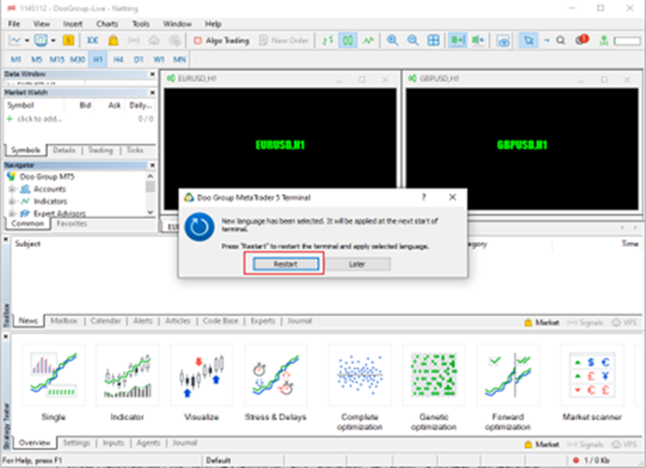 Después de completar la selección, aparecerá una ventana emergente que le pedirá al usuario que reinicie MT5, haga clic en [Reiniciar] para reiniciar.