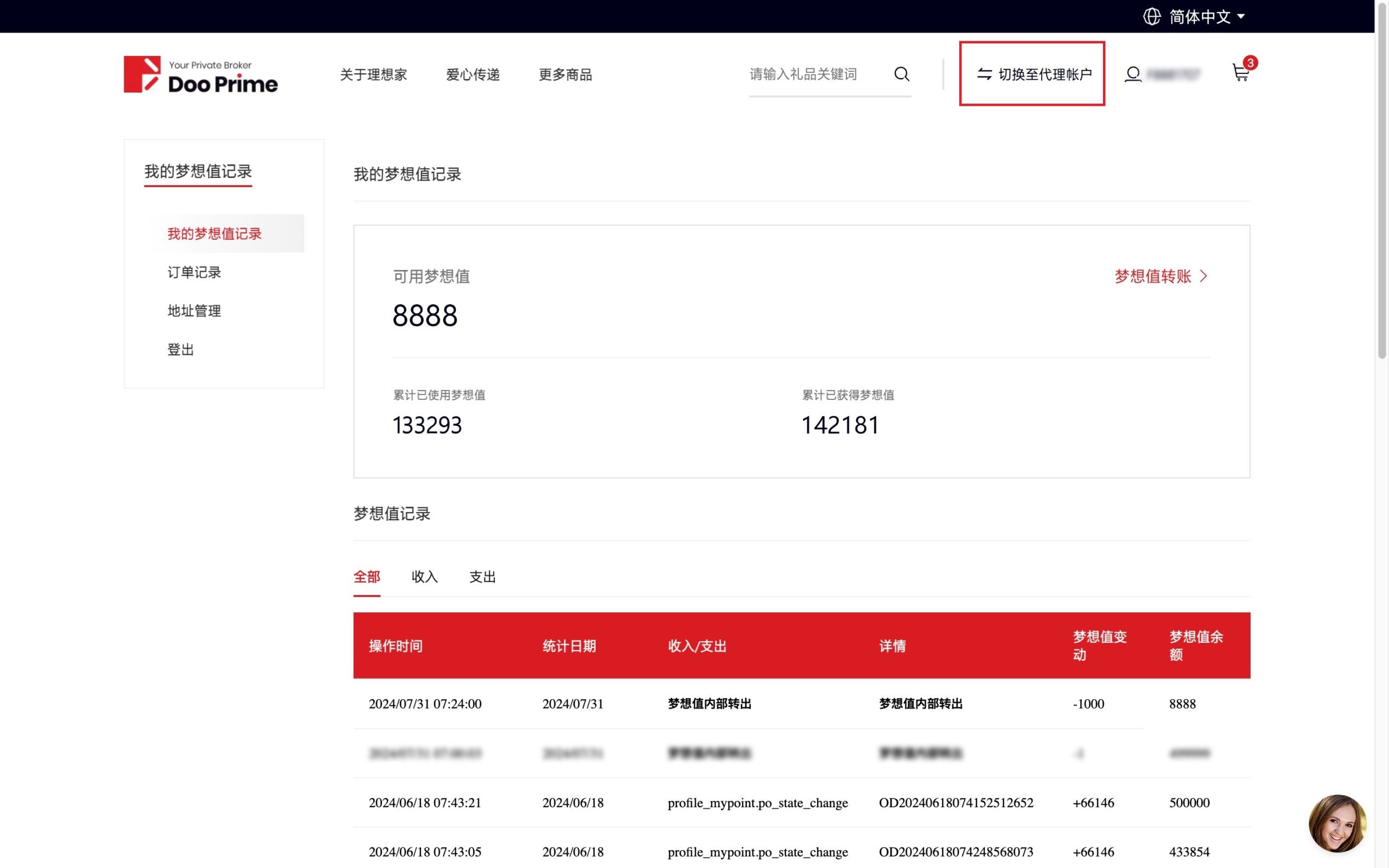 Mude a função da conta no canto superior direito da barra de navegação para visualizar o status dos pontos da conta com o mesmo nome.