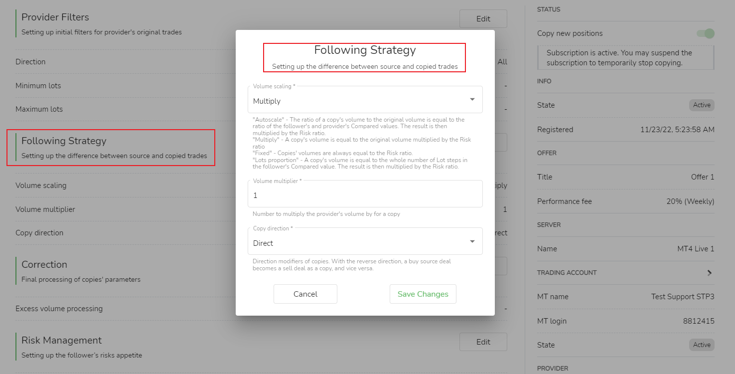 O volume da cópia comercial depende do saldo atual ou patrimônio da conta do seguidor. Os seguidores podem ajustar o volume de negociação de cópias de acordo com o saldo atual da conta ou valor líquido para controlar o risco de cópia