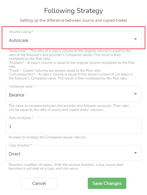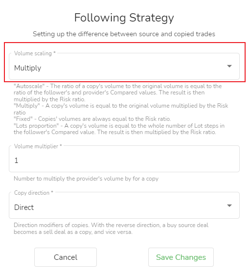 Volume de negociação do seguidor = volume de negociação da fonte de sinal * multiplicador do volume de negociação