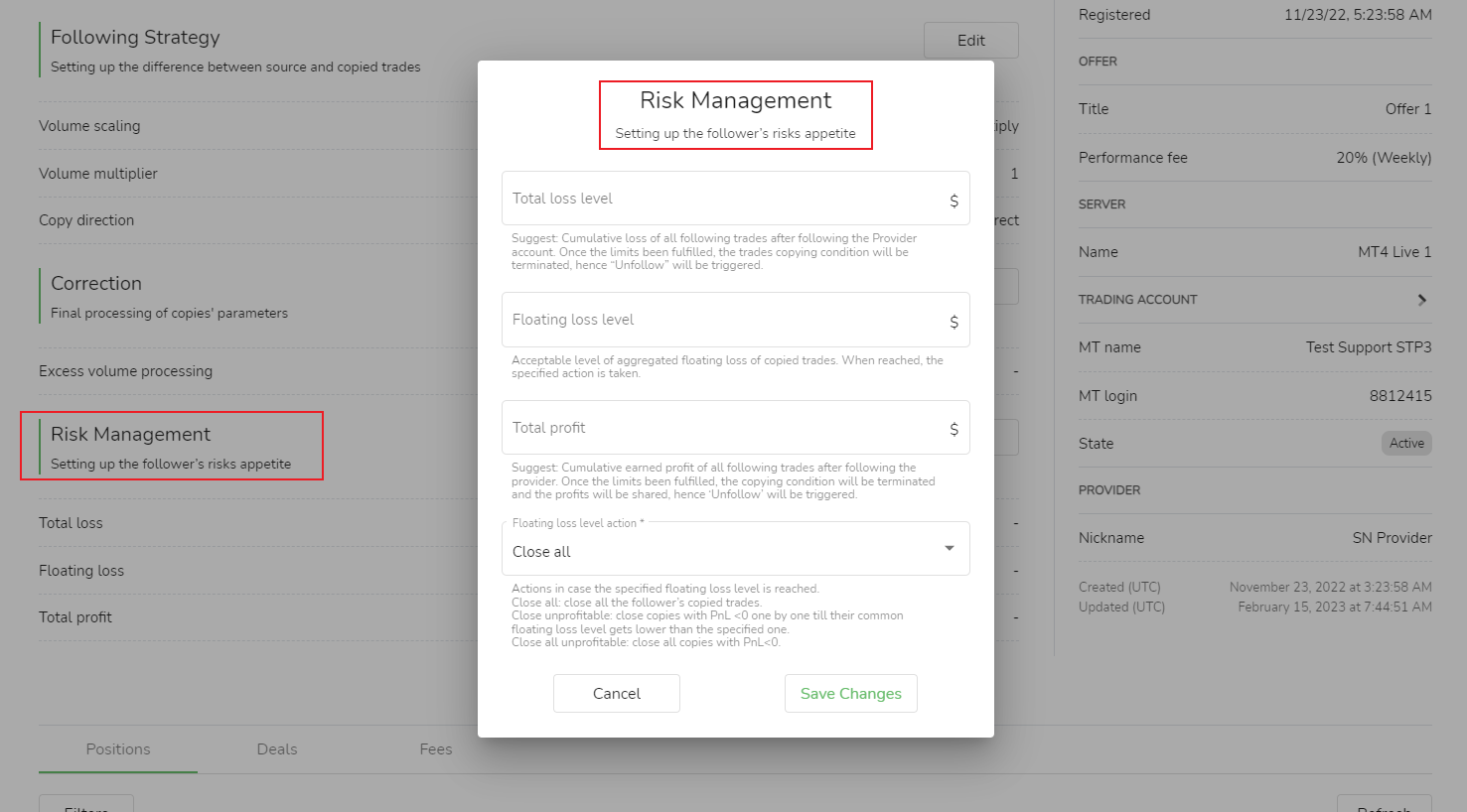 Os seguidores podem definir níveis de take-profit e stop-loss no gerenciamento de risco para gerenciar o risco de suas próprias contas.