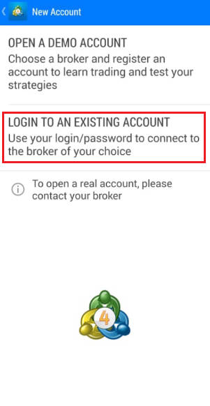 Depois de instalar a versão móvel do MetaTrader 4, clique para abrir o software para entrar na página de login. Se você já abriu uma conta real, selecione "Fazer login em uma conta existente".