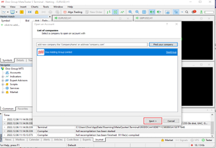 Clique duas vezes para abrir o MT5, selecione [Login to Trading Account] na barra de menu superior [File], procure o servidor de negociação especificado e clique em [Continue]